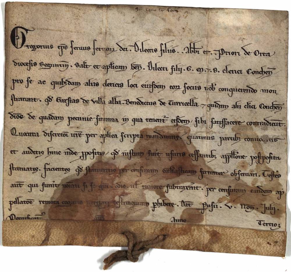 Litterae executoriae de Gregorio IX por la que nombra jueces al Abad [Juan Gonzalo] y al Prior del monasterio de Santa María de Huerta en el pleito de G. M. y S., clérigos de Cuenca, contra García de Villalba, Benito de Torrecilla y otros clérigos de la misma ciudad en razón de cierta cantidad de dinero que les adeudan. |