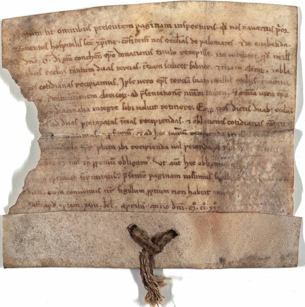 Carta de reconocimiento de Navarro, Prior del convento de Santa Cristina, de los dos tercios de los ingresos de las iglesias de Palomares y Huertabellida recibidos de García Ruiz, Obispo de Cuenca, con reserva del tercio privativo episcopal. |