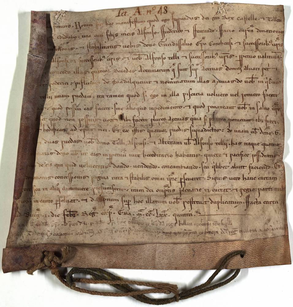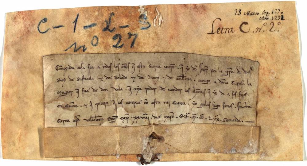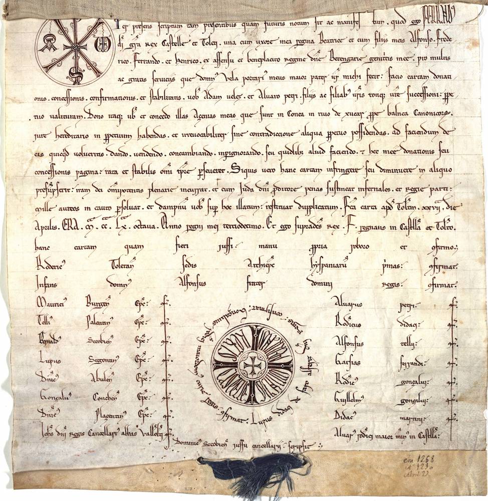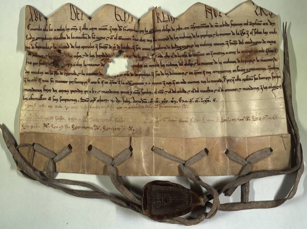 Carta abierta de Fernando III por la que entrega una aceña a Gonzalo Ibáñez, Obispo de Cuenca, dos a Tello Alfonso y otra a Alfonso Tello en el río Guadalquivir. |