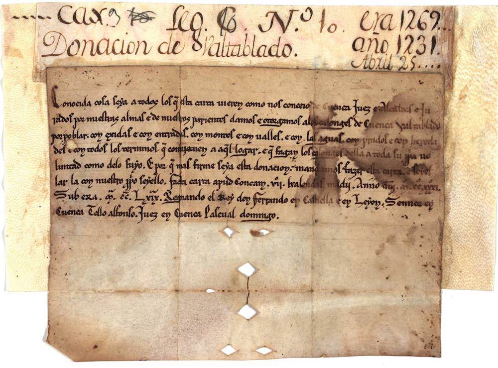 Carta de donación del Concejo de Cuenca al Cabildo de la aldea de Valtablado y su término, con el compromiso de su poblamiento. |