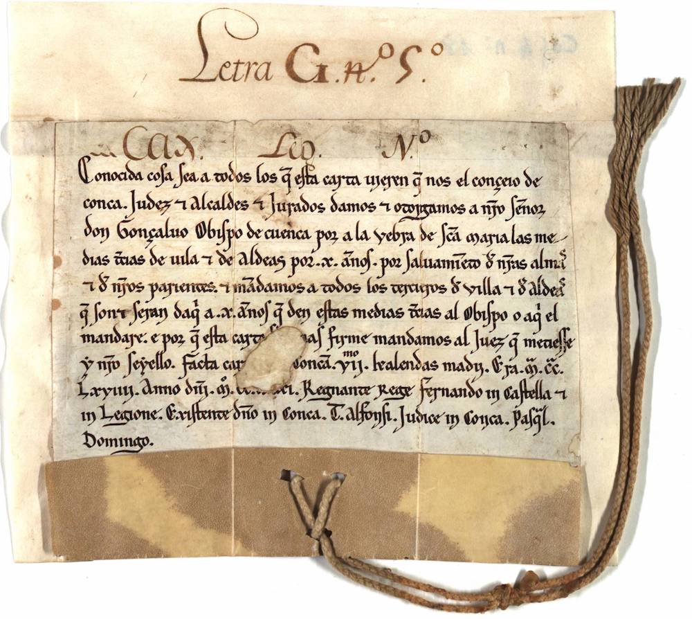 Carta de cesión del Concejo de Cuenca a Gonzalo Ibáñez, Obispo de Cuenca, de las medias tercias de las villas y aldeas de ésta ciudad durante diez años para dotar la obra de Santa María la Mayor. |