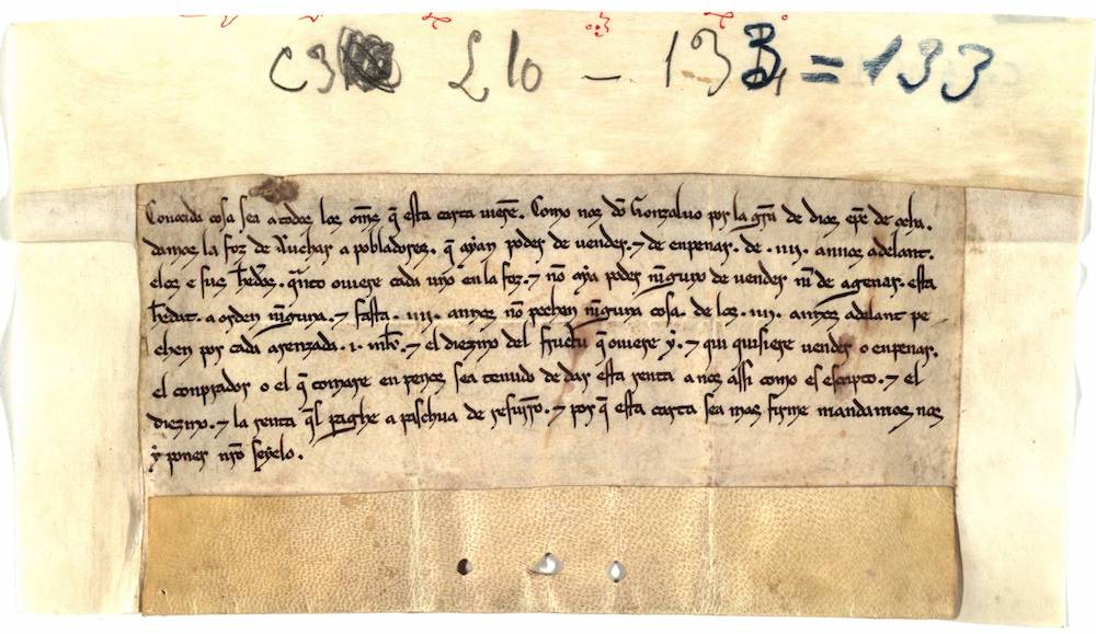 Carta de donación de Gonzalo Ibáñez, Obispo de Cuenca, de la hoz del Júcar a sus pobladores, y exención de pecho durante los próximos cuatro años; pagando después un maravedí por cada aranzada de cultivo y el diezmo del fruto obtenido. |