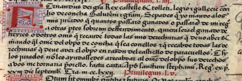 Mandato de Fernando III para que se respete el derecho del Obispo de Cuenca al portazgo del ganado que pase por el castillo de Paracuellos a tierra de moros. |