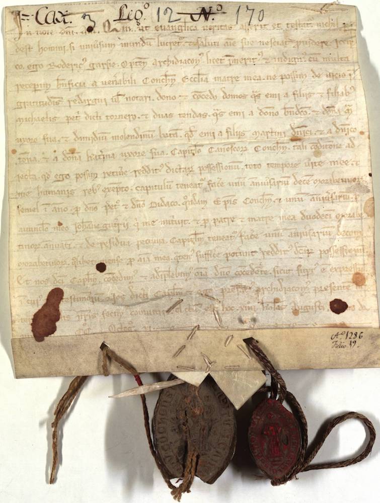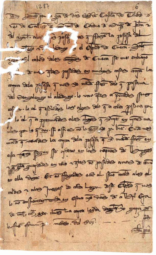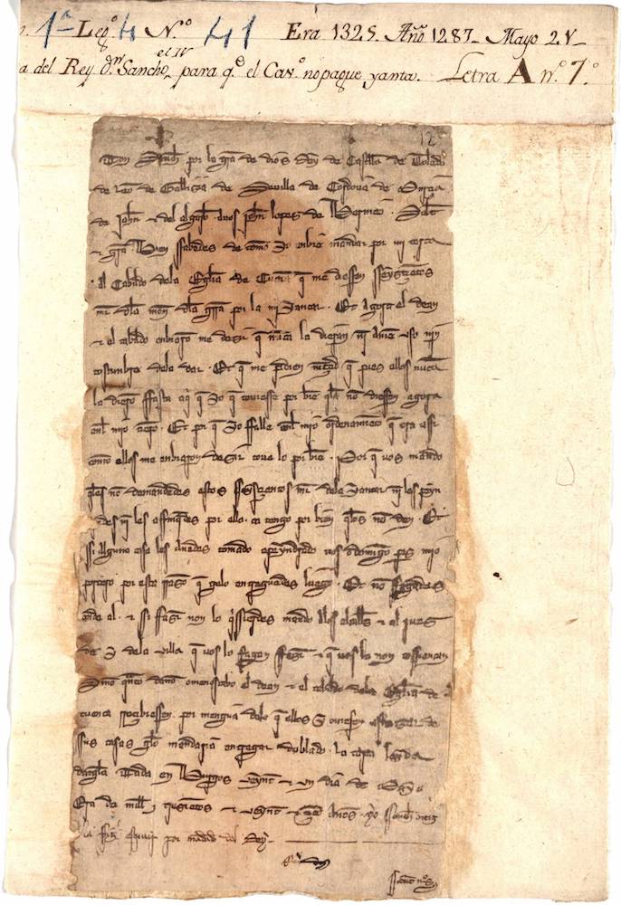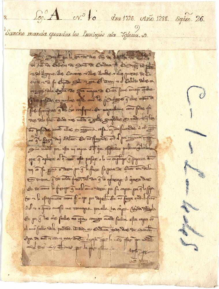Mandato de Sancho IV, a petición de Gonzalo Pérez Gudiel, Arzobispo de Toledo, por el que exime de pesquisa a los bienes donados a la Iglesia de Cuenca por los hombres buenos. |