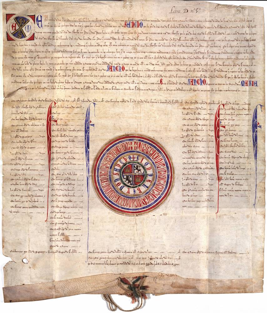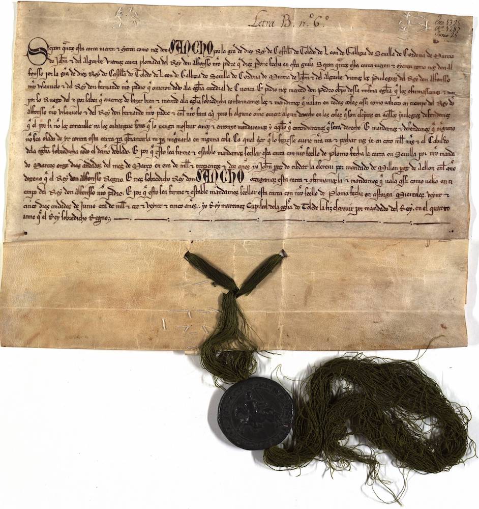 Carta plomada de Sancho IV por la que confirma otra de Alfonso X (Sevilla, martes, 11 de marzo de 1264), en la que ratificaba los privilegios concedidos por sus antepasados a la Iglesia de Cuenca. |