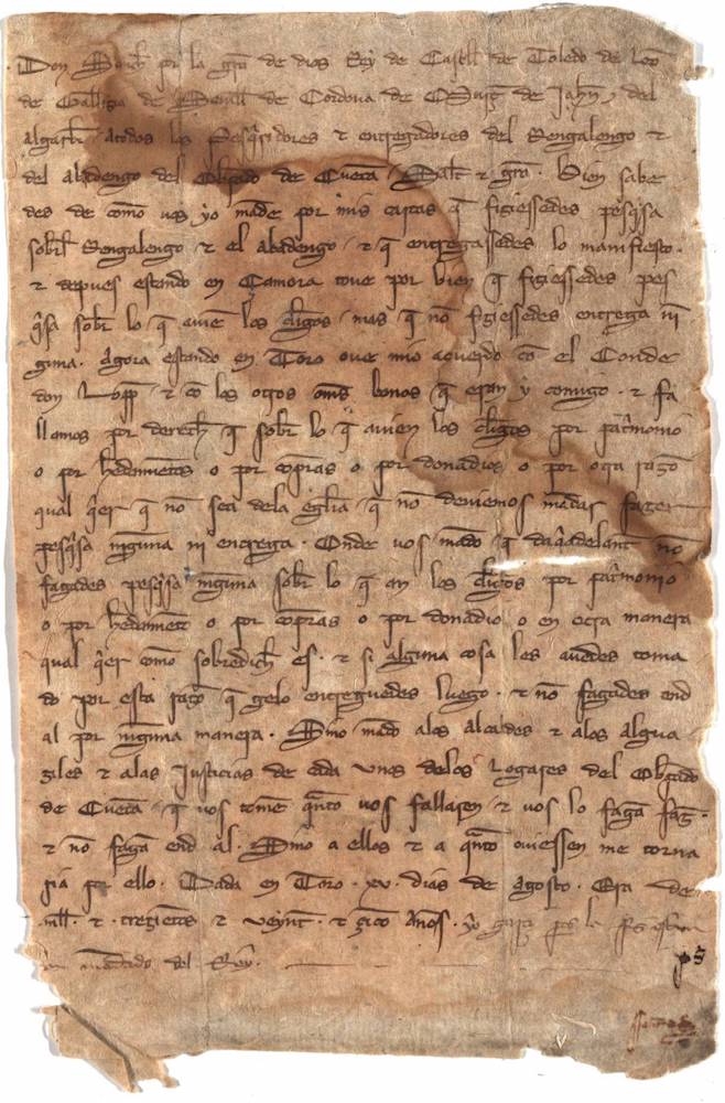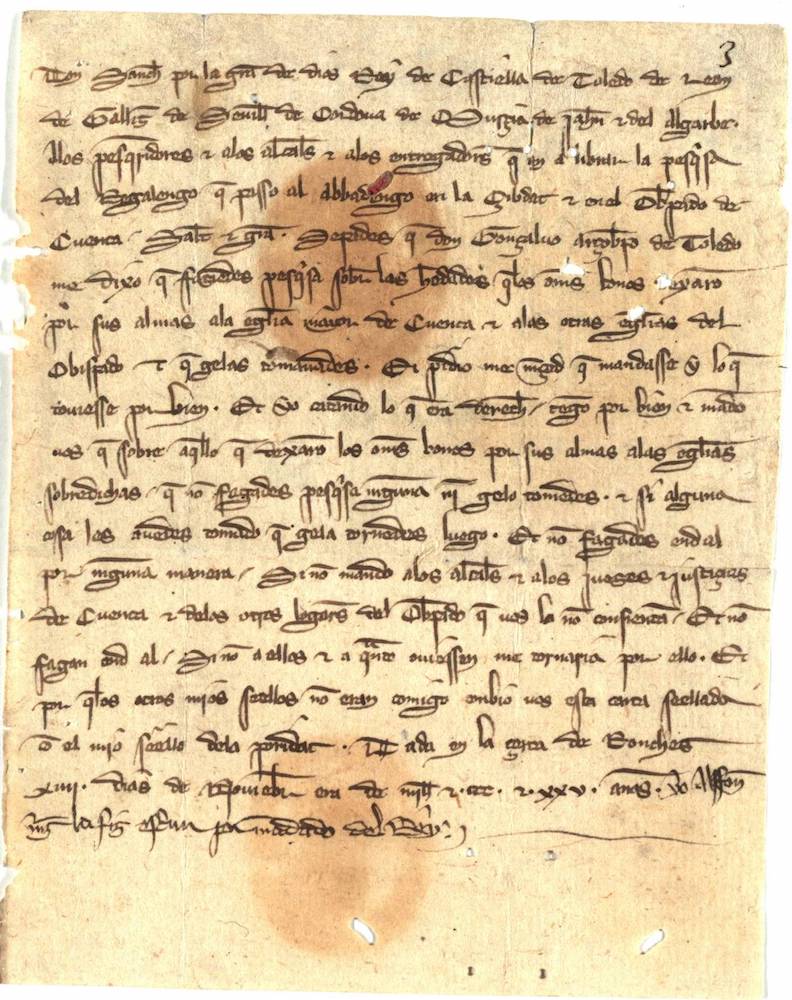 Mandato de Sancho IV para que los pesquisidores de lo que pasó del realengo al abadengo en el Obispado de Cuenca, no hagan averiguaciones sobre las propiedades de los clérigos y devuelvan lo tomado en pesquisas anteriores. |