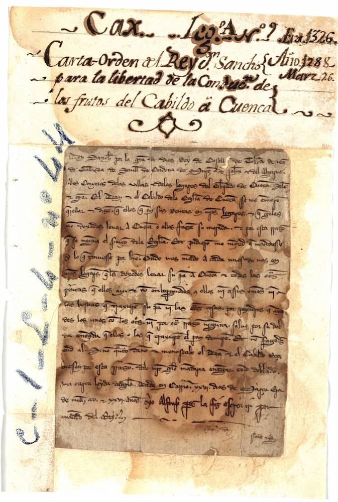 Mandato de Sancho IV, a petición del Cabildo, para que los concejos del Obispado de Cuenca no obstaculicen la libre circulación de las rentas del Cabildo. |
