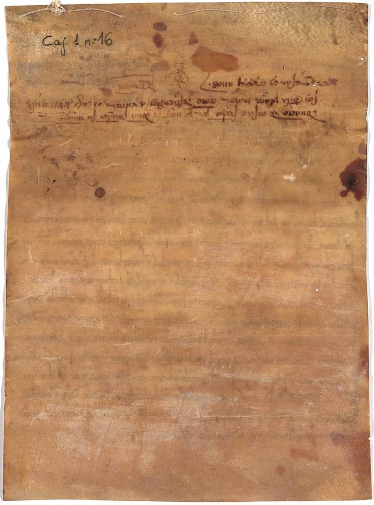A.- A. C. C., I, caja 1, nº. 16. (OlimLeg. P, Nº. 4). Pergamino de 262 x 190 mm. Minúscula diplomática. Latín. Tinta ocre claro.