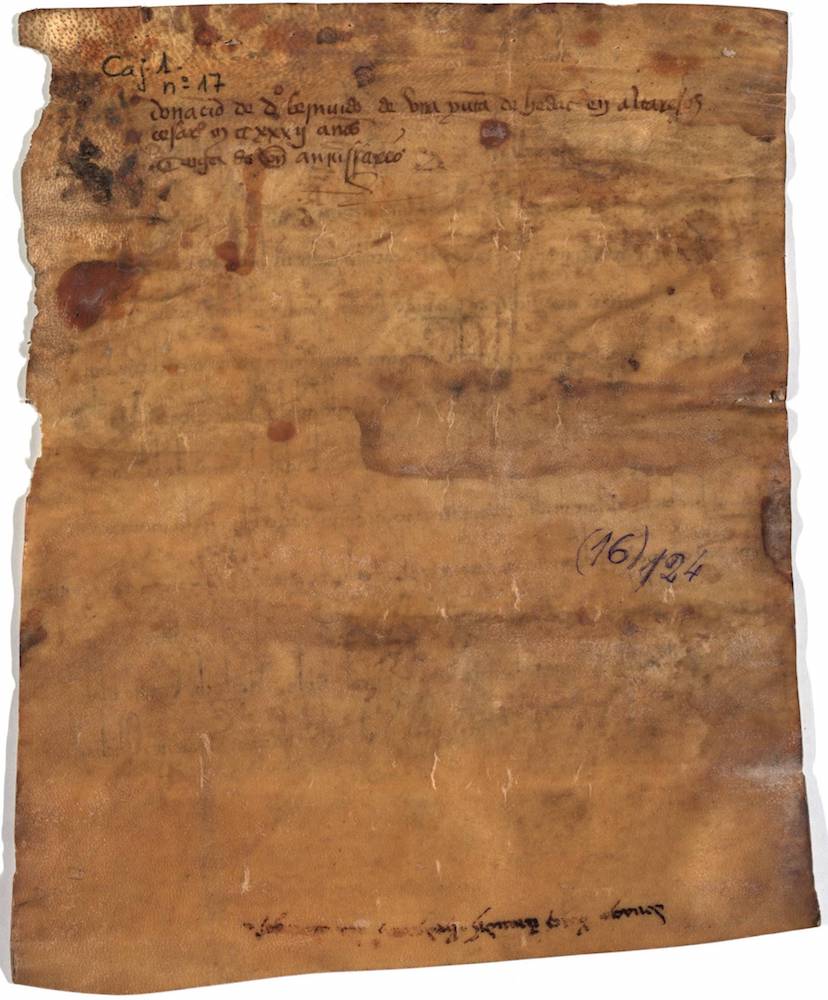 A.- A. C. C., I, caja 1, nº. 17. (Olim Caj. 3, leg. P, Nº. 5; Caj. 3, Leg. 10, Nº. 124). Pergamino de 265 x 210 mm. Minúscula diplomática. Latín. Tinta ocre. Regular conservación.