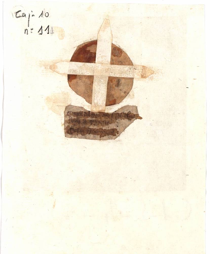 A.- A. C. C., I, caja 10, nº. 11. (Olim Caxón 1, Leg. 4, Nº. 40). Papel de 138 x 192 mm. Gótica de albalaes. Tinta ocre. Regular conservación. Sello de placa al dorso.