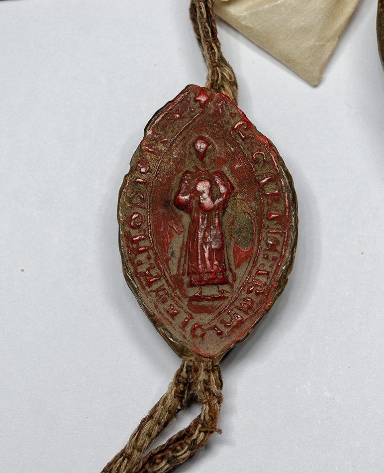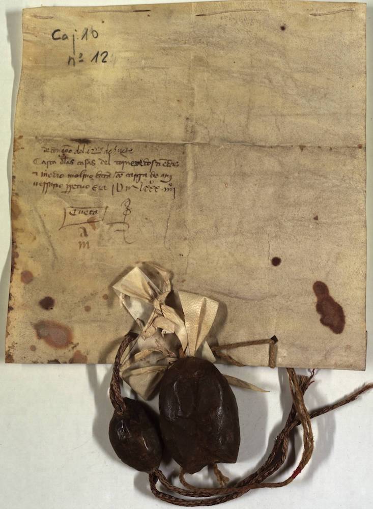 A.- A. C. C., I, caja 10, nº. 12. (Olim Caxón 3, Leg. 12, Nº. 170). Pergamino de 200+24 x 190 mm. Gótica semicursiva. Latín. Tinta ocre claro. Mala conservación. Dos sellos de cera pendientes.