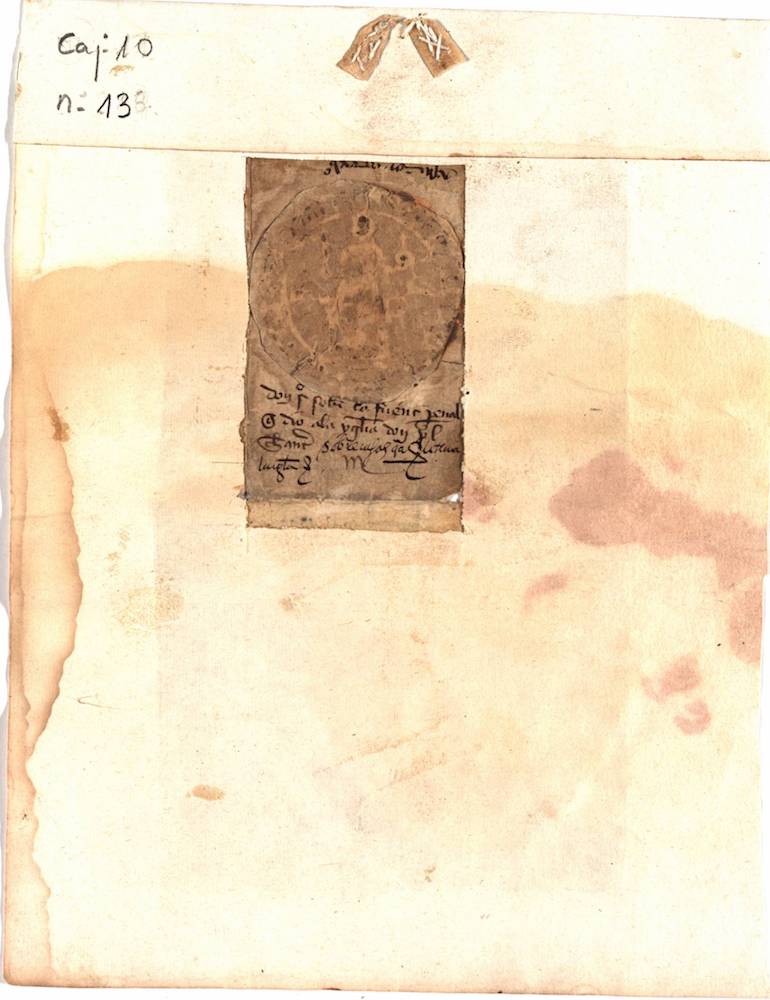 A.- A. C. C., I, caja 10, nº. 13. (Olim Letra E, Nº. 13). Papel de 205 x 155 mm. Gótica de albalaes. Tinta ocre oscuro. Regular conservación. Sello de placa al dorso.