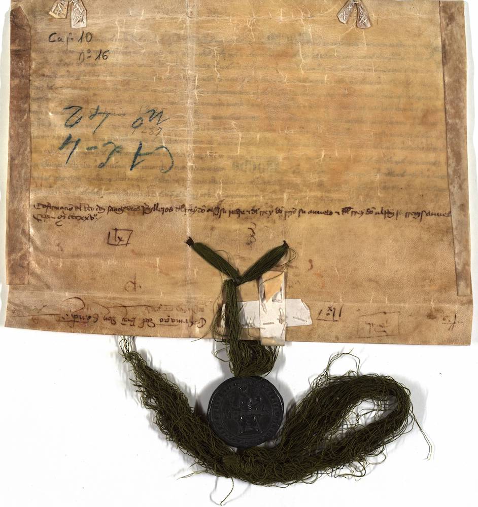 A.- A. C. C., I, caja 10, nº. 16. (Olim Letra B, Nº. 6; Caxón 1, Leg. 4, Númº. 42). Pergamino de 249+79 x 331 mm. Gótica de privilegios. Tinta ocre. Sello de plomo pendiente.
