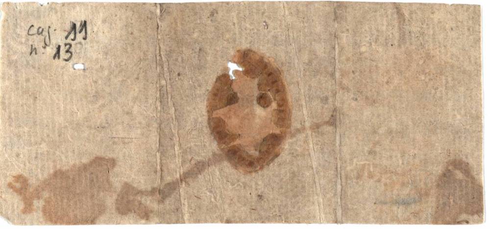 A.- A. C. C., I, caja 11, nº. 13. Papel de 73 x 160 mm. Gótica de albalaes. Tinta ocre. Regular conservación. Restos de sello de cera pendiente.