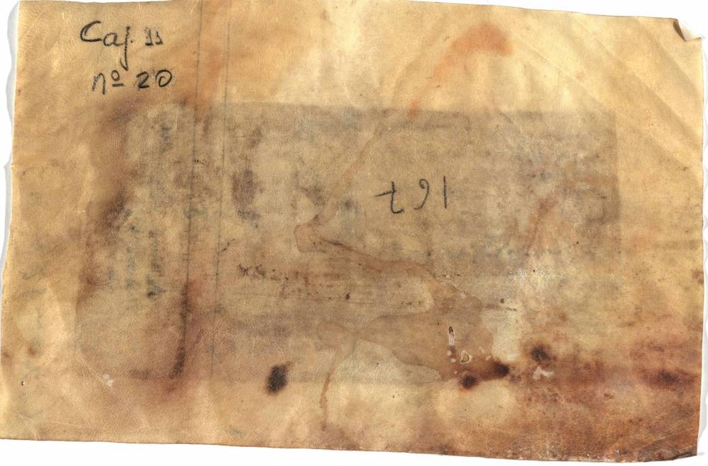 A.- A. C. C., I, caja 11, nº. 20. (Olim C. 6, L. 25, Nº. 429). Pergamino de 95 x 189 mm. Gótica de albalaes. Tinta ocre claro. Mala conservación.