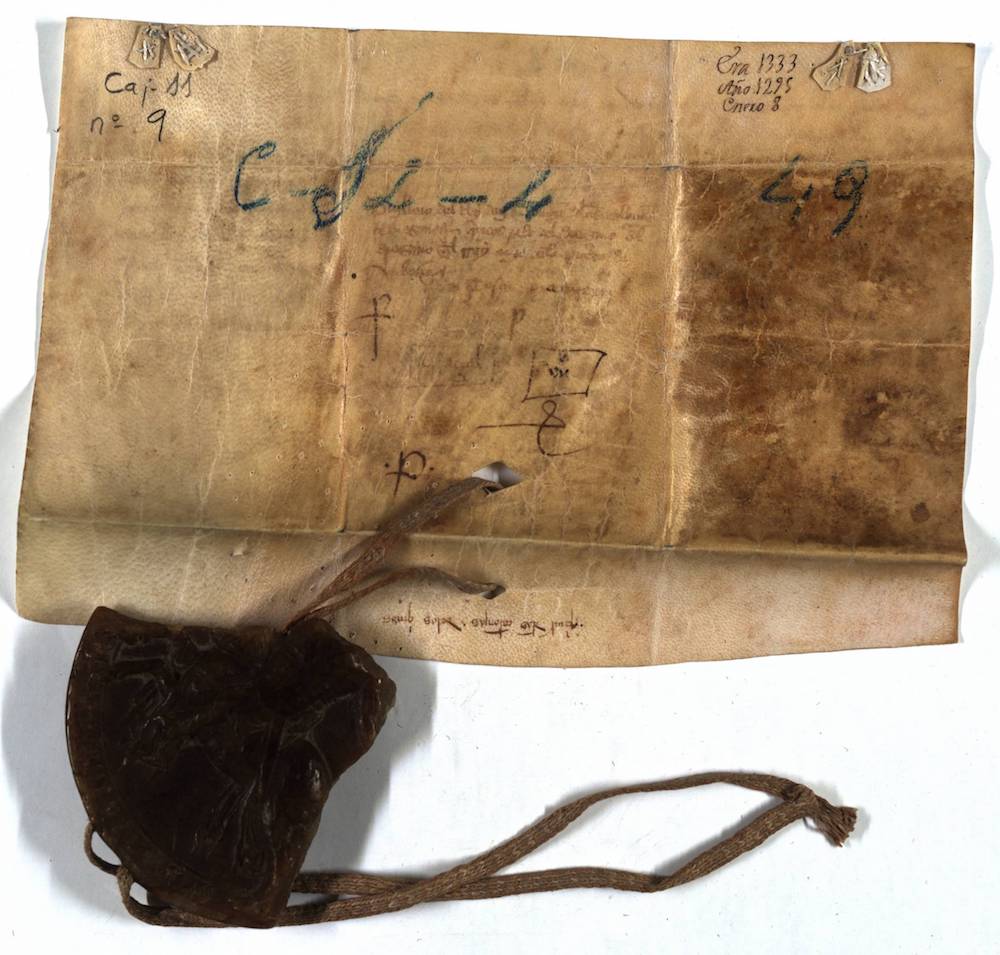 A.- A. C. C., I, caja 11, nº. 9. (Olim Letra C, Nº. 8; Caj. 12, Leg. 4, Nº. 49). Pergamino de 152+35 x 274 mm. Gótica semicursiva. Tinta ocre. Sello de cera pendiente, deteriorado.