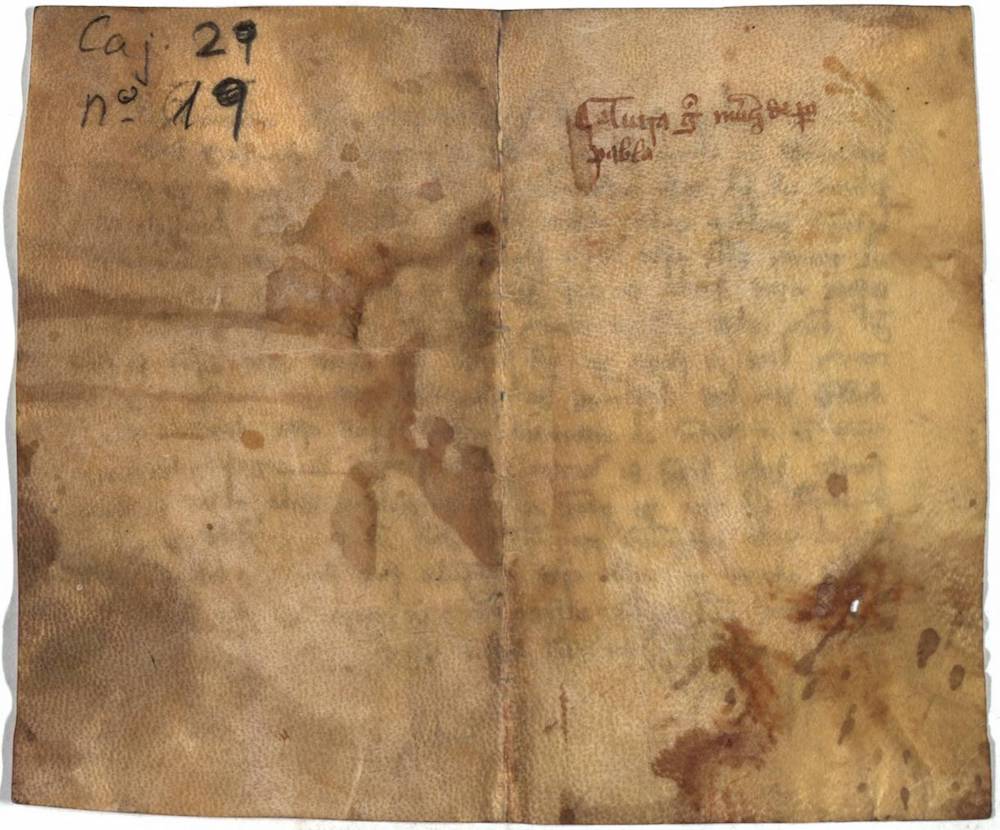 A.- A. C. C. I, caja 29, nº. 19. Pergamino de 125 x 148 mm. Precortesana. Tinta ocre. Regular conservación.