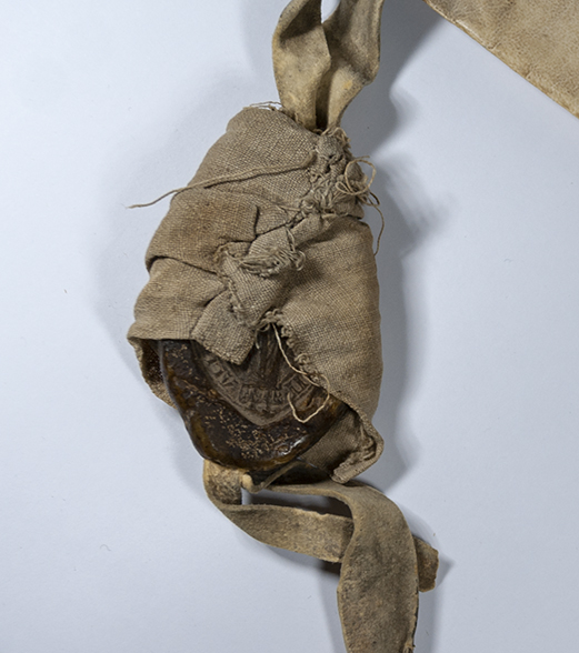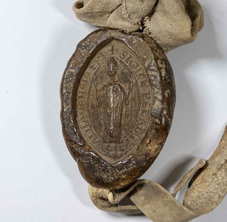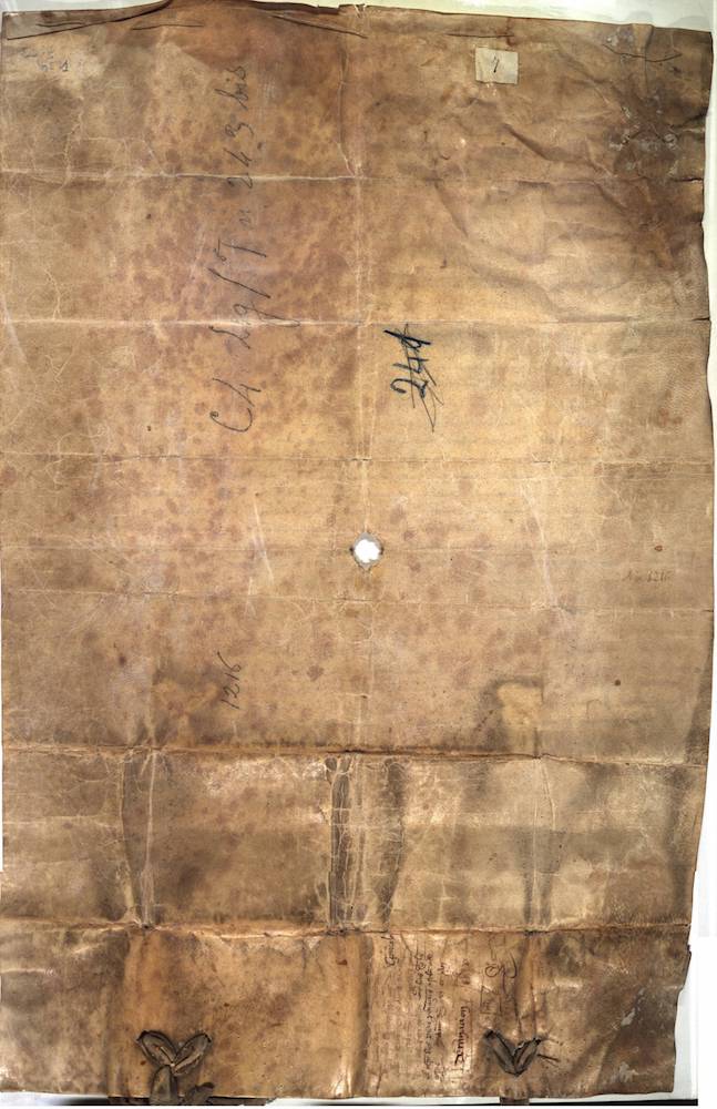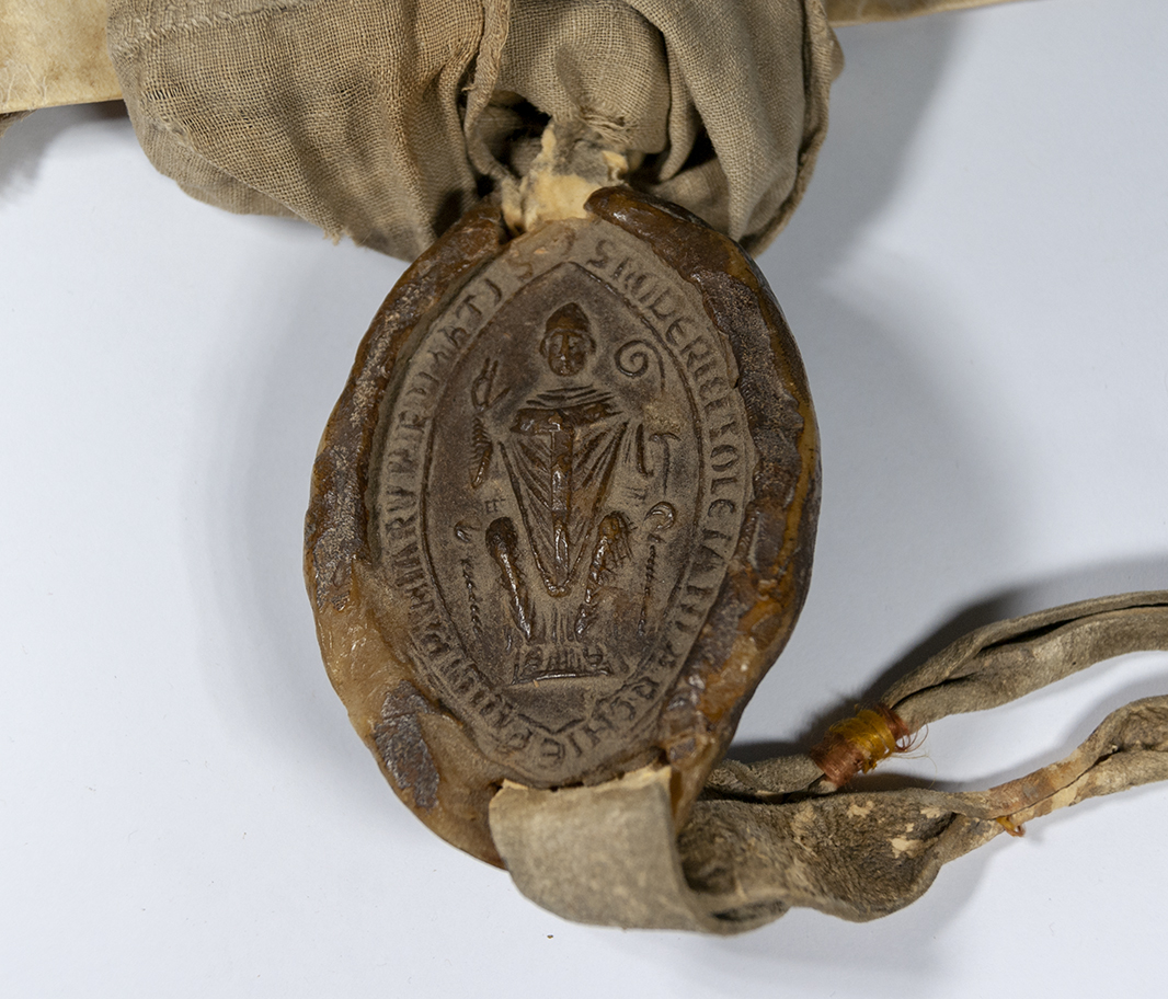 A.- A. C. C., I, caja 3, nº. 1. (Olim C.4, Leg. 17, Nº. 243 bis). Pergamino de 630+95 x 420 mm. Gótica cancilleresca. Latín. Tinta ocre. Dos sellos de cera pendientes.