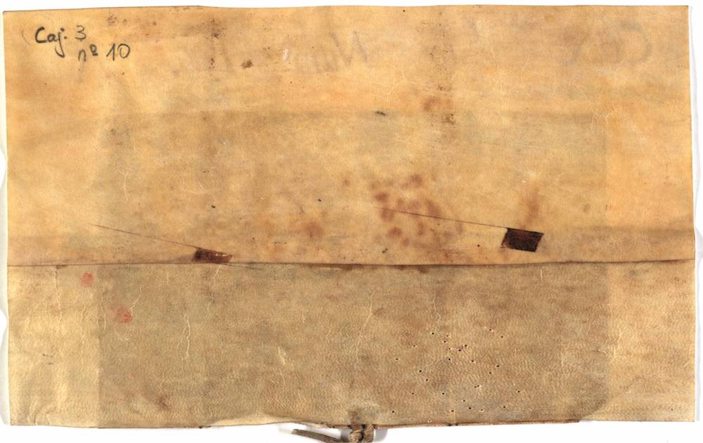 A.- A. C. C., I, caja 3, nº. 10. (Olim Cax. 4, Leg. 17, Nº. 241 bis). Pergamino de 120+23 x 200 mm. Minúscula diplomática. Latín. Tinta ocre. De los tres sellos que ha tenido sólo conserva un lemnisco.