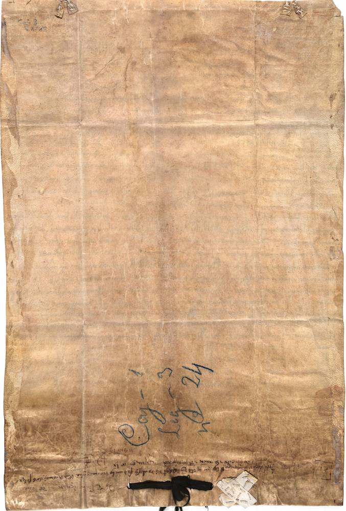 A.- A. C. C., I, caja 3, nº. 12. (Olim Letra D, Nº. 9; Caxón 1, Leg. 3, Nº. 24). Pergamino de 560+45 x 385 mm. Minúscula diplomática. Latín. Tinta ocre oscuro. No conserva el sello, sólo lemnisco.