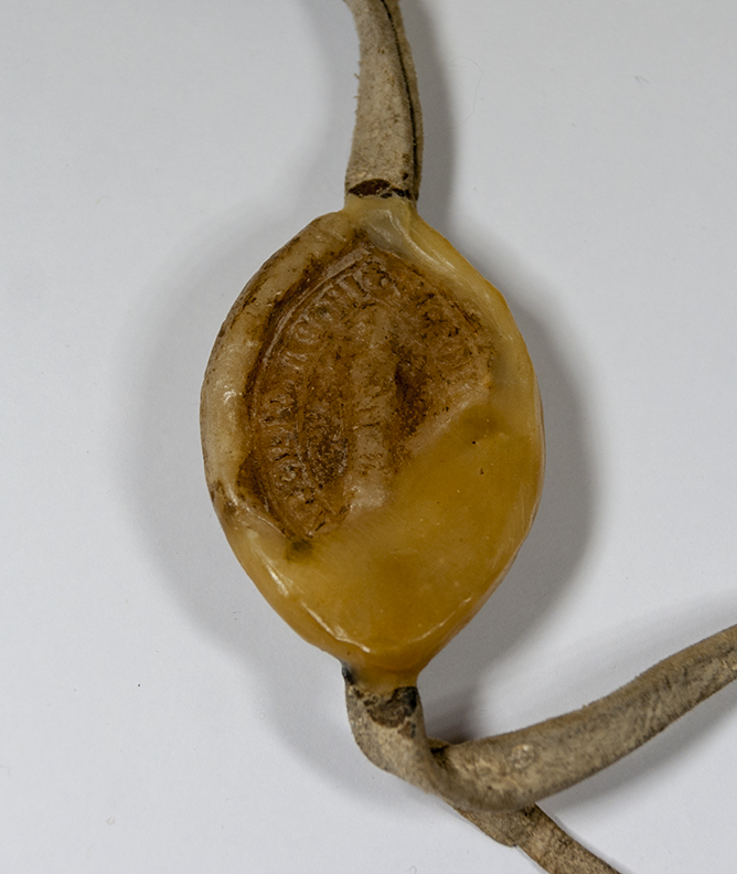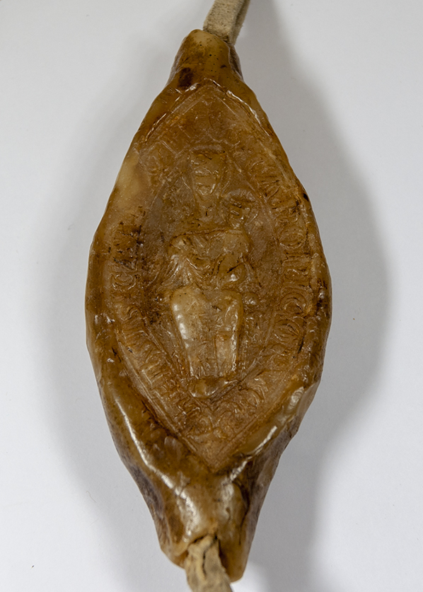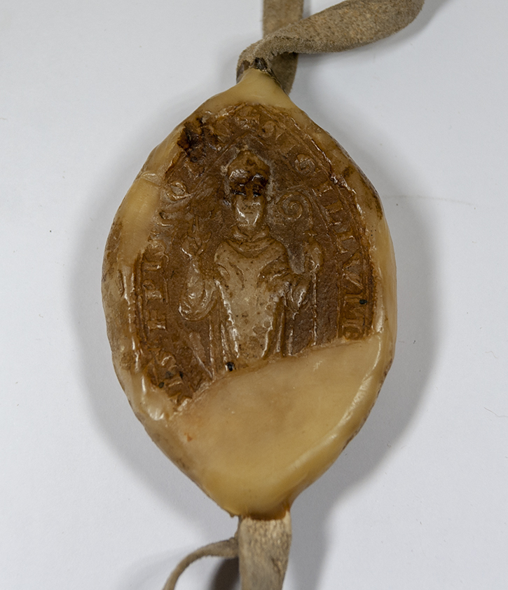A.- A. C. C., I, caja 3, nº. 13. (Olim Letra C, Nº. 377). Pergamino de 723+55 x 580 mm. Minúscula diplomática. Latín. Tinta ocre. Restaurado. Conserva cinco sellos de cera pendientes de los siete que tuvo.