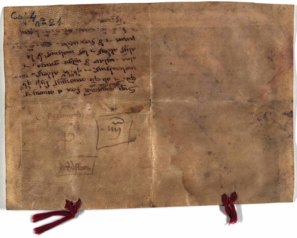 A.- A. C. C., I, caja 4, nº. 21. Pergamino de 145+12 x 205 mm. Minúscula diplomática. Latín. Tinta ocre. Mala conservación. No conserva los dos sellos, sólo sus lemniscos.