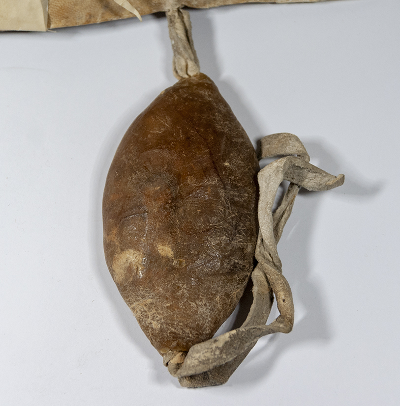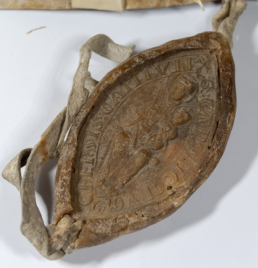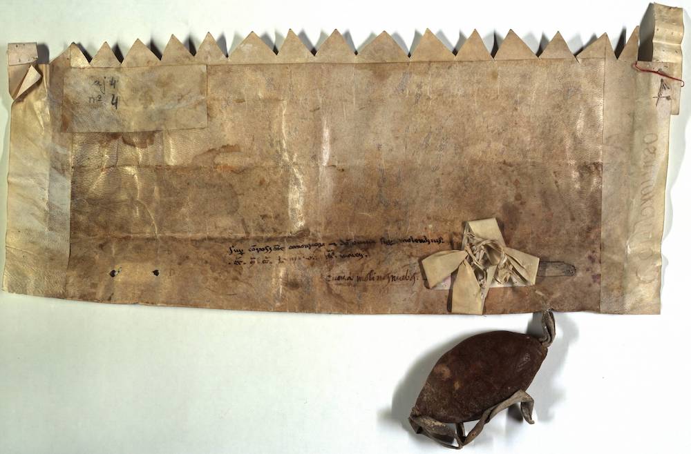 A.- A. C. C., I, caja 4, nº. 4. Pergamino partido por abc en la parte superior de 185+32 x 395 mm. Minúscula diplomática. Castellano y latín. Tinta ocre claro. Mala conservación. Un sello de cera pendiente y falta otro.