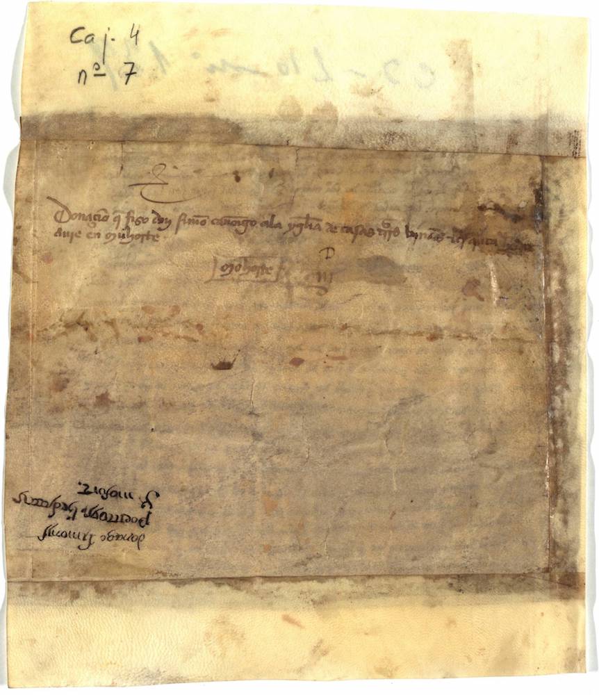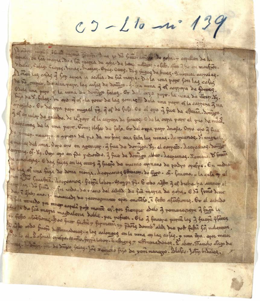 A.- A. C. C., I, caja 4, nº. 7. (Olim Caxón 3, Leg. 10, Númº. 139). Pergamino de 191 x 288 mm. Minúscula pregótica. Castellano y latín. Tinta ocre.