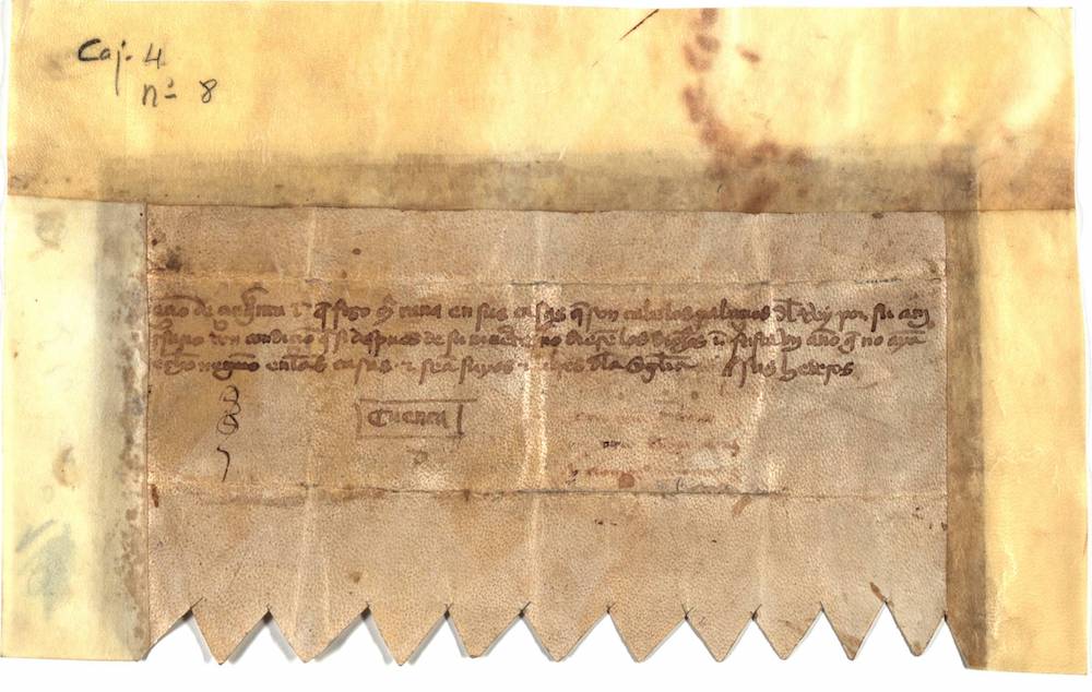A.- A. C. C., I, caja 4, nº. 8. (Olim Caxón 3, Leg. 10, Númº. 140). Pergamino partido por abc en la parte inferior de 140 x 244 mm. Minúscula diplomática. Castellano y latín. Tinta ocre.