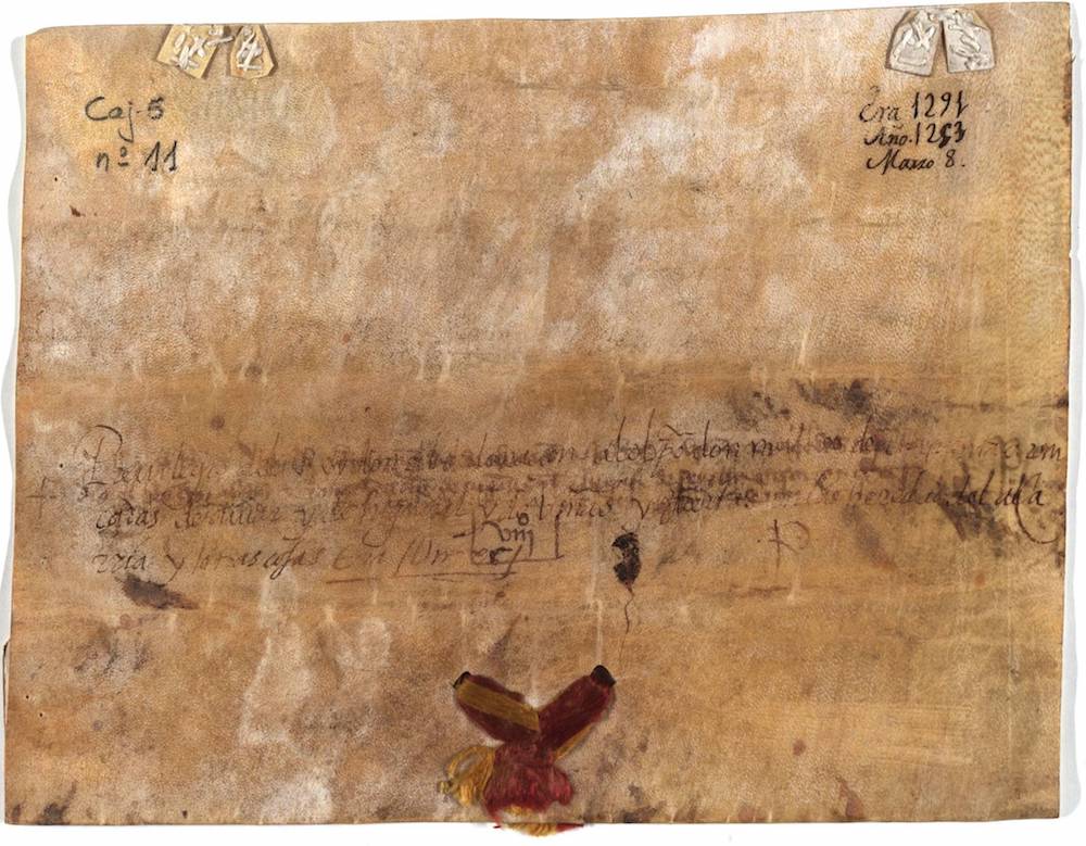 Carta plomada de Alfonso X por la que dona a Mateo Reinal, Obispo de Cuenca, 50 aranzadas de olivar, higuera, huerto y viña en la heredad de Barananiz, y seis yugadas de bueyes para pan en la heredad de Notias, término de Focalcázar, ambas en la Alcarria.