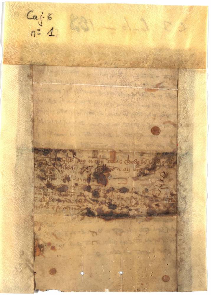 A.- A. C. C., I, caja 6, nº. 1. (Olim Caxón 3, Leg. 10, Númº. 138). Pergamino de 217+30 x 158 mm. Gótica semicursiva. Castellano y latín. Tinta ocre. Regular conservación. No conserva el sello.