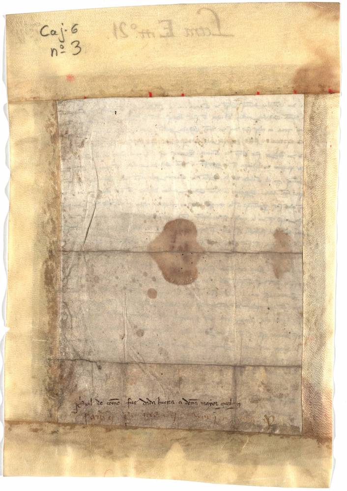 A.- A. C. C., I, caja 6, nº. 3. (Olim Letra E, Nº. 21). Pergamino de 258 x 190 mm. Gótica semicursiva. Tinta ocre oscuro. Regular conservación. No conserva el sello.