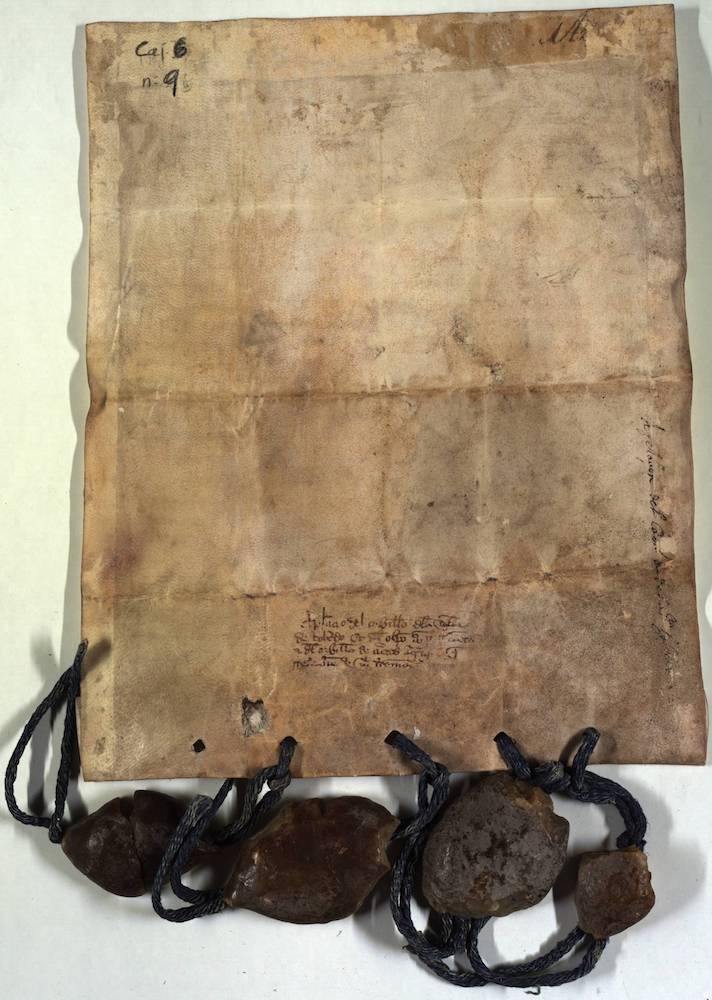 A.- A. C. C., I, caja 6, nº. 9. Pergamino de 275+25 x 225 mm. Gótica semicursiva. Latín. Tinta ocre. Conserva cuatro sellos de cera pendientes de los cinco que tuvo.