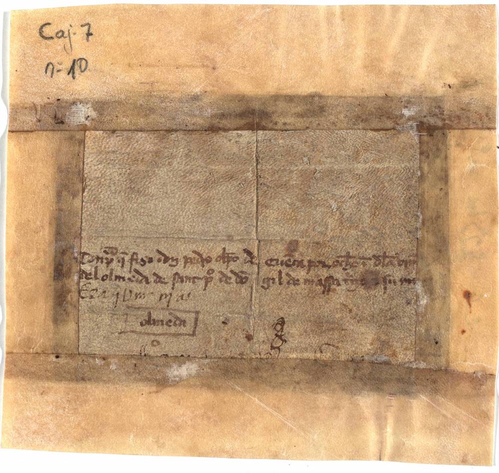 A.- A. C. C., I, caja 7, nº. 10. (Olim Cajon C, Nº. 149; C. 6, L. 23 bis, Nº. 361). Pergamino de 120 x 157 mm. Gótica semicursiva. Tinta ocre oscuro. Mala conservación.