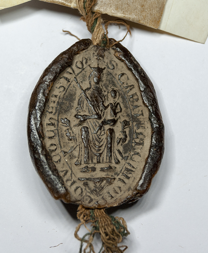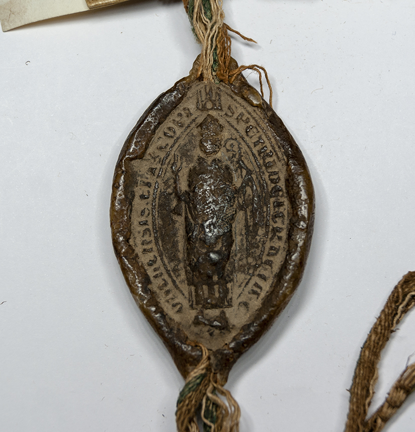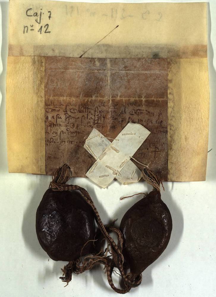 A.- A. C. C., I, caja 7, nº. 12. (Olim C. 3, L. 11, Nº. 151). Pergamino de 116+19 x 134 mm. Gótica semicursiva. Tinta ocre claro. Dos sellos de cera pendientes.