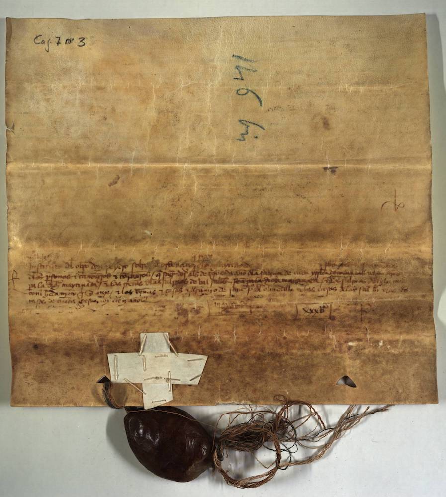 A.- A. C. C., I, caja 7, nº. 3. (Olim Cax. 3, Leg. 11, Nº. 146 bis). Pergamino de 290+37 x 314 mm. Gótica semicursiva. Tinta ocre oscuro. Conserva un sello de cera pendiente de los dos que tuvo.
