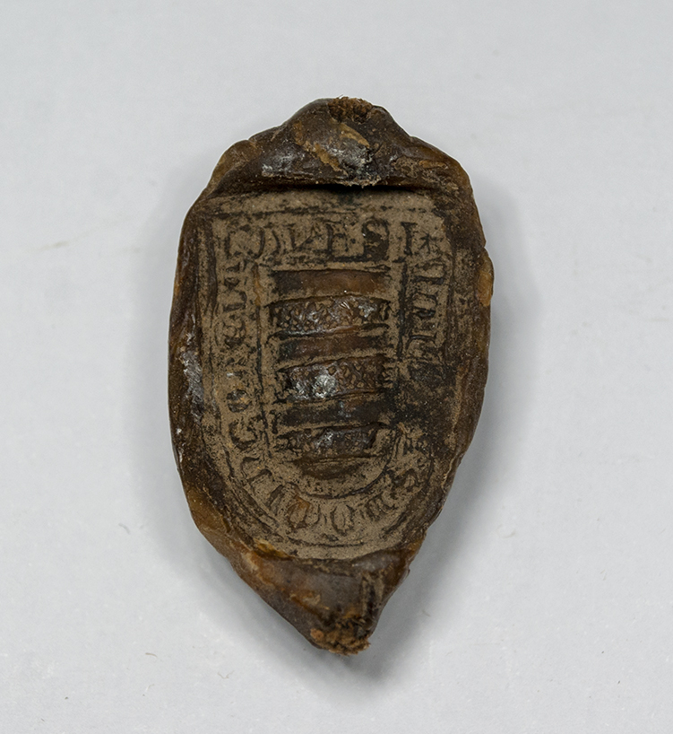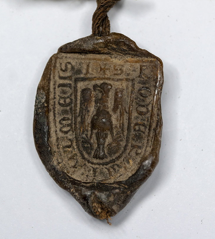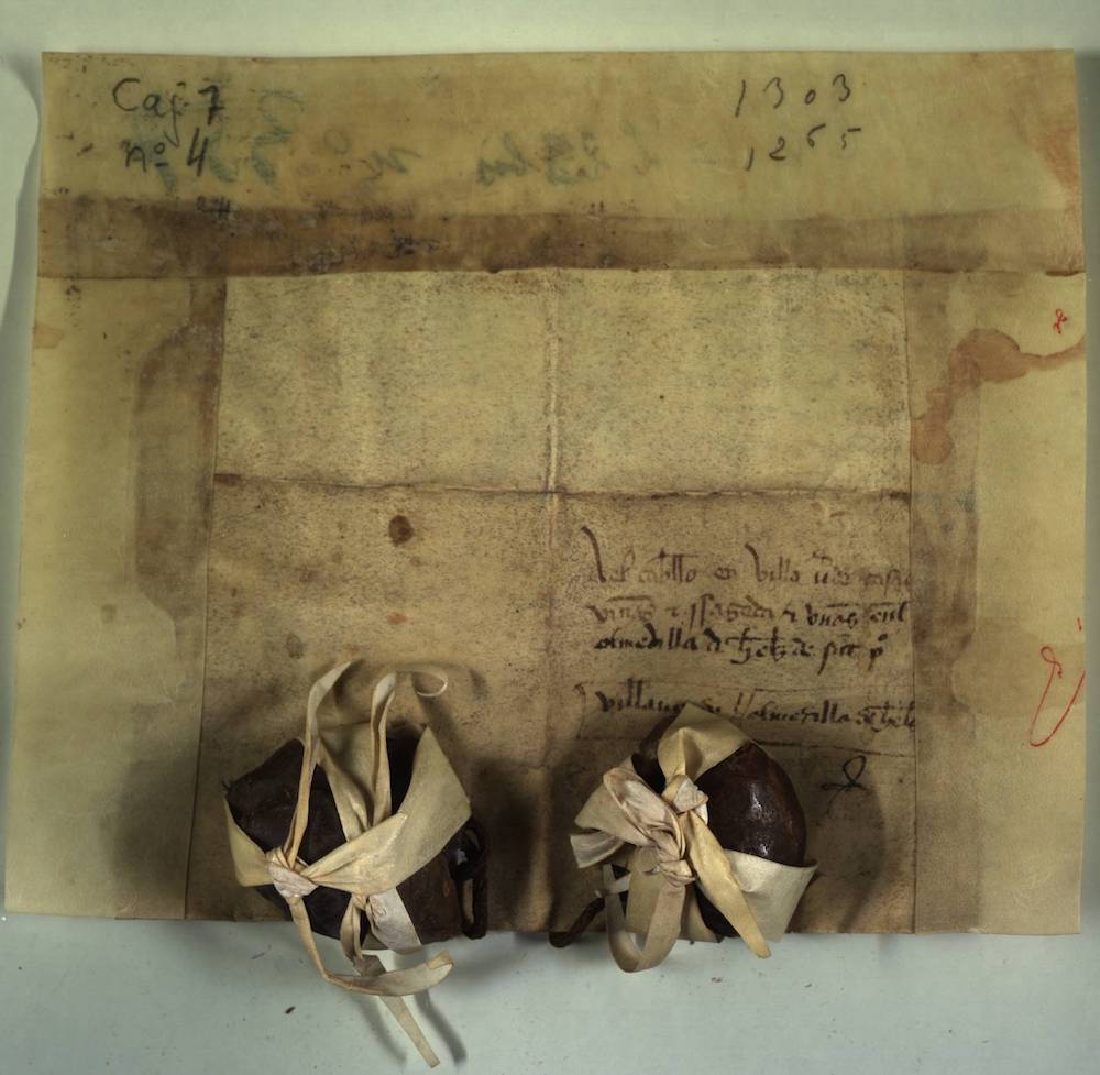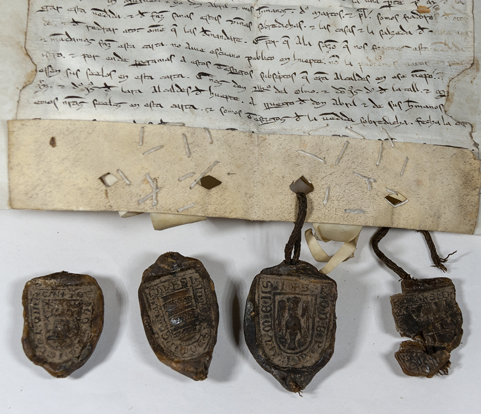 A.- A. C. C., I, caja 7, nº. 4. (Olim C. 6, L. 23 bis, Nº. 357). Pergamino de 140+30 x 166 mm. Gótica semicursiva. Tinta ocre. Mala conservación. Conserva cuatro sellos de cera pendientes.