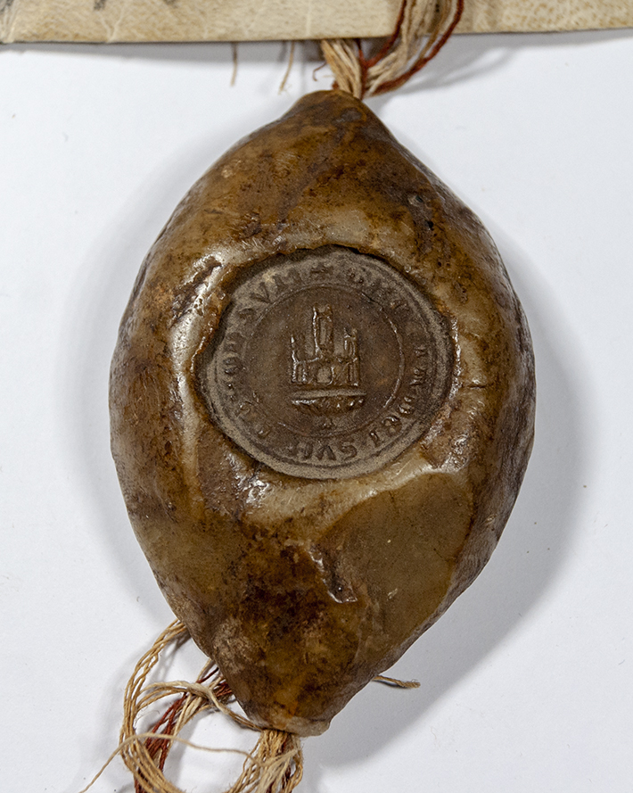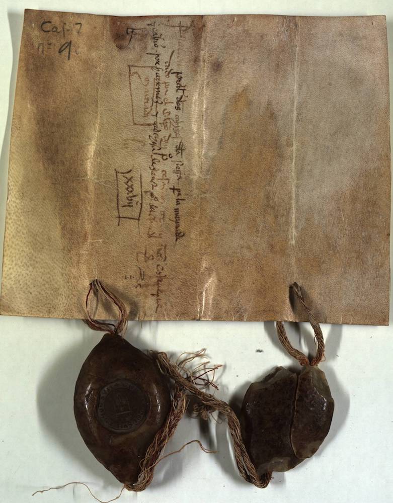 A.- A. C. C., I, caja 7, nº. 9. (Olim C. 3, L. 11, Nº. 147). Pergamino de 166+35 x 200 mm. Gótica de albalaes. Tinta ocre claro. Regular conservación. Dos sellos de cera pendientes.