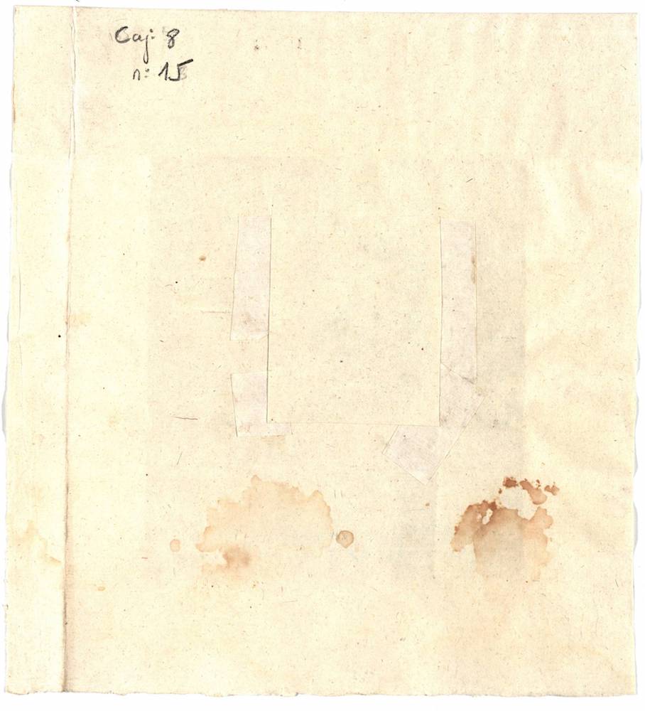 A.- A. C. C., I, caja 8, nº. 15. (Olim E, Nº. 5). Papel de 155 x 140 mm. Gótica de albalaes. Tinta ocre. Mala conservación. Restos de sello de placa al dorso.
