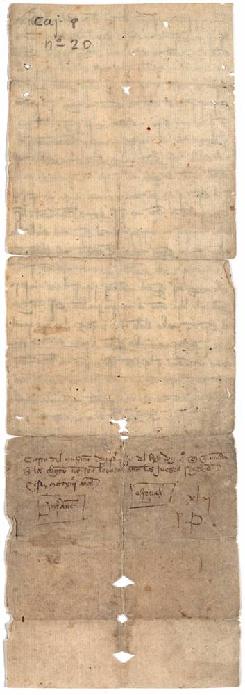 A.- A. C. C., I, caja 8, nº. 20. Papel de 373+40 x 140 mm. Gótica de albalaes. Tinta ocre. Mala conservación. No conserva el sello.