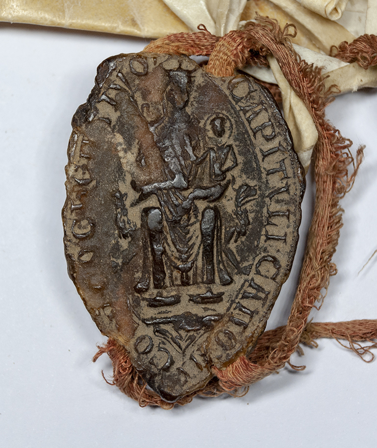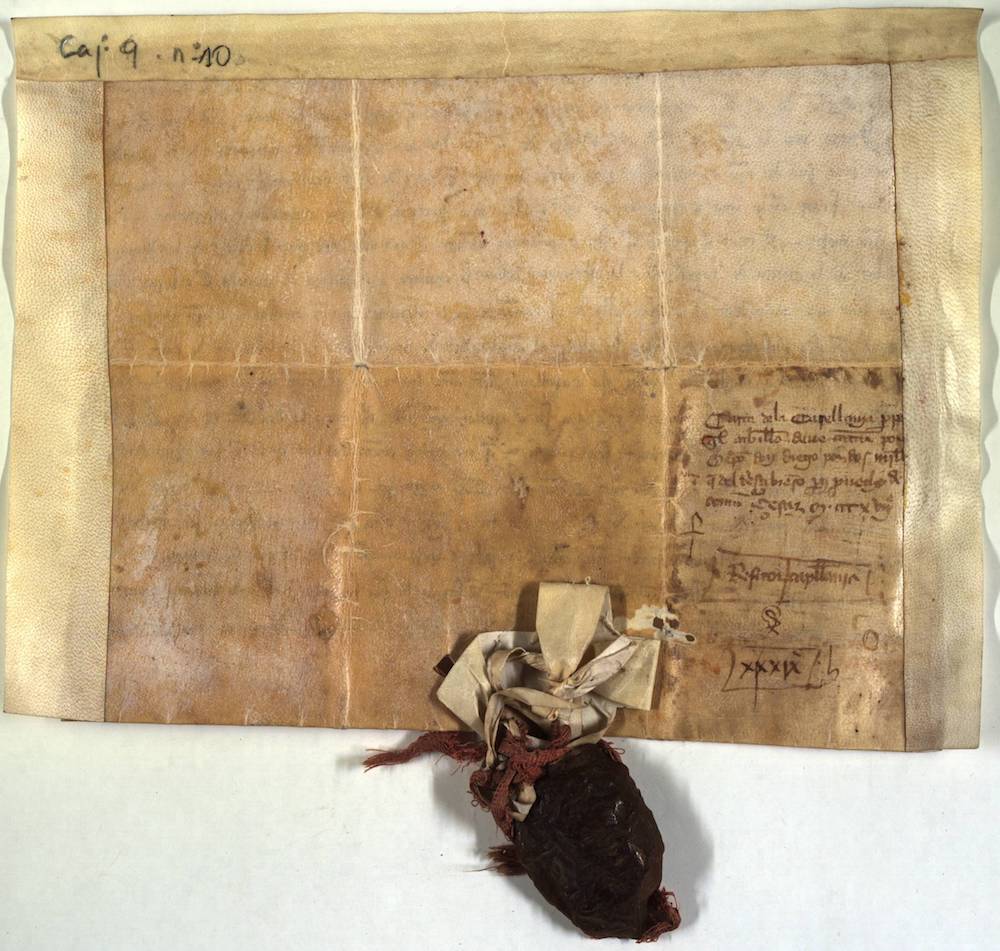 A.- A. C. C., I, caja 9, nº. 10. (Olim Caxón 8, Leg. 32, Nº. 630). Pergamino de 224+27 x 260 mm. Gótica semicursiva. Tinta ocre. Sello de cera pendiente.