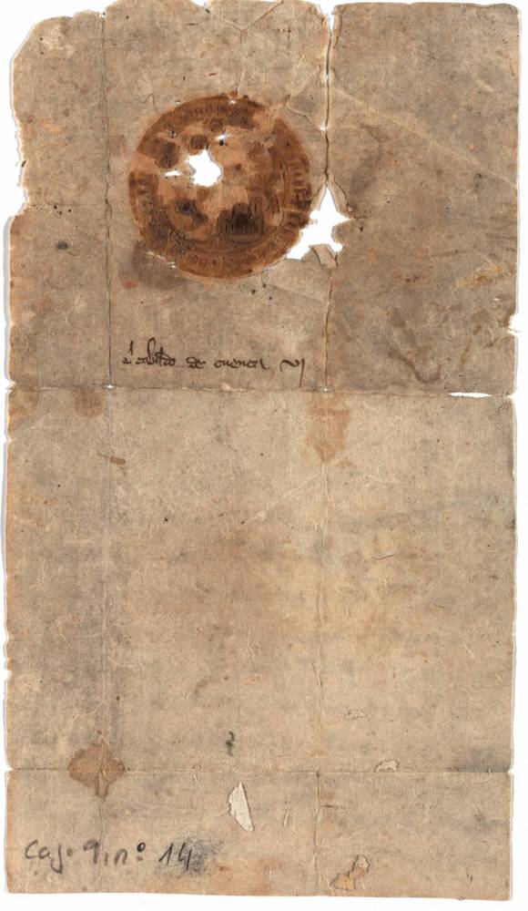 A.- A. C. C., I, caja 9, nº. 14. Papel de 245 x 138 mm. Gótica de albalaes. Tinta ocre oscuro. Mala conservación, roto en la parte superior. Sello de placa al dorso, deteriorado.