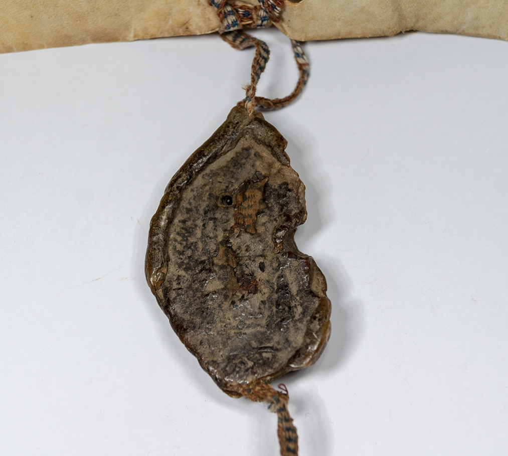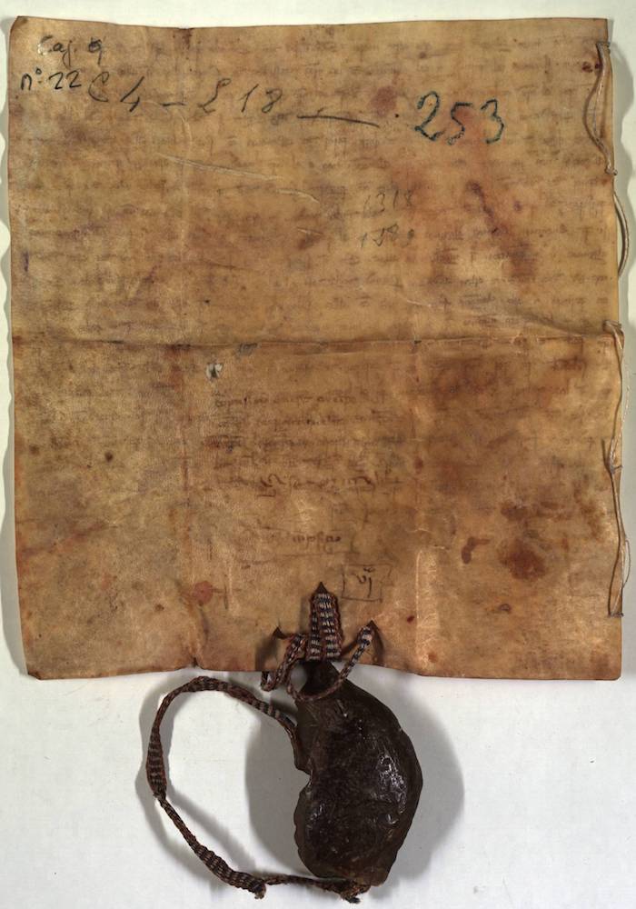 A.- A. C. C., I, caja 9, nº. 22. (Olim C. 4, L. 18, Nº. 253). Pergamino de 225+46 x 203 mm. Gótica de albalaes. Tinta ocre. Mala conservación. Sello de cera pendiente muy deteriorado.
