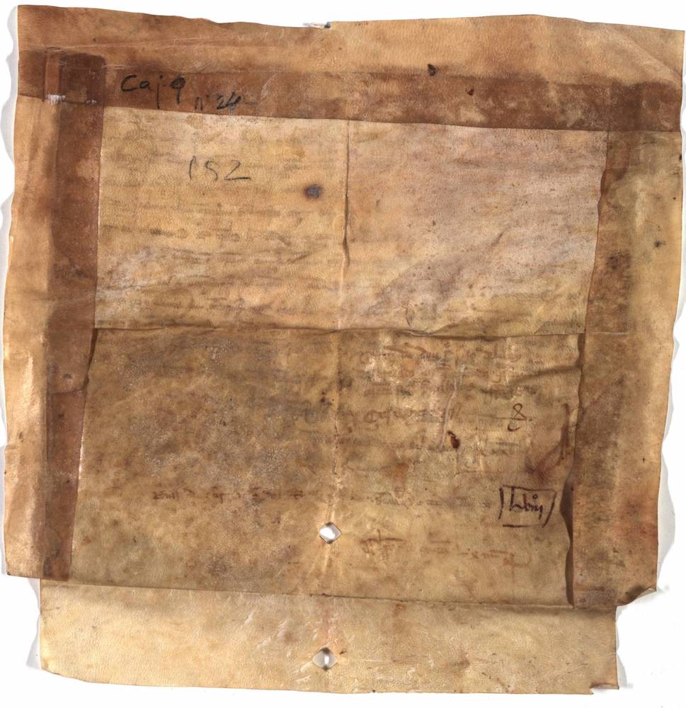 A.- A. C. C., I, caja 9, nº. 24. (Olim Letra E, Nº. 10). Pergamino de 180+32 x 196 mm. Gótica de albalaes. Tinta ocre claro. Mala conservación. No conserva el sello.