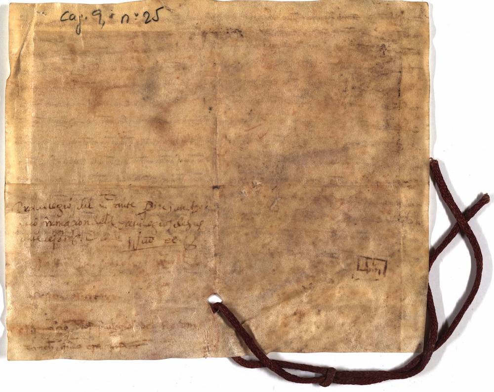 A.- A. C. C., I, caja 9, nº. 25. (Olim Letra E, Nº. 11). Pergamino de 170+30 x 205 mm. Gótica de albalaes. Tinta ocre claro. Mala conservación. No conserva el sello, sólo restos de lemnisco.