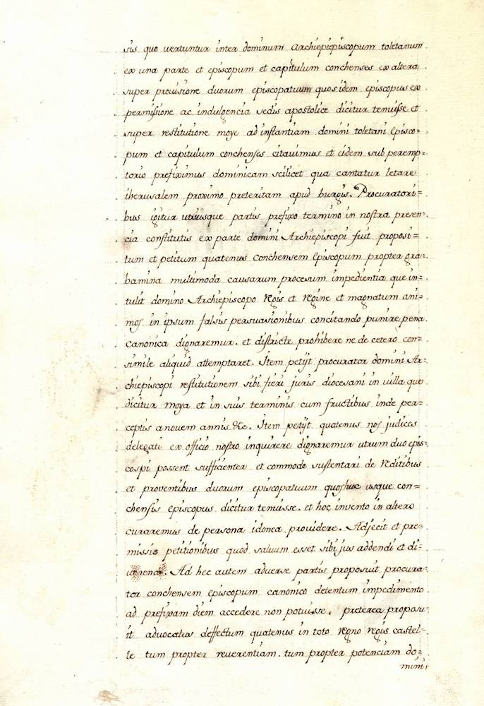 Acta de apertura del pleito entre Rodrigo Giménez de Rada, Arzobispo de Toledo, y García Ruiz, Obispo de Cuenca, por la delimitación de los antiguos obispados de Ercávica y Valeria y la jurisdicción de la villa y aldeas de Moya, ante los jueces delegados por Honorio III, Mauricio, Obispo de Burgos, R., Abad de Rioseco, y Asensio, canónigo de Burgos.